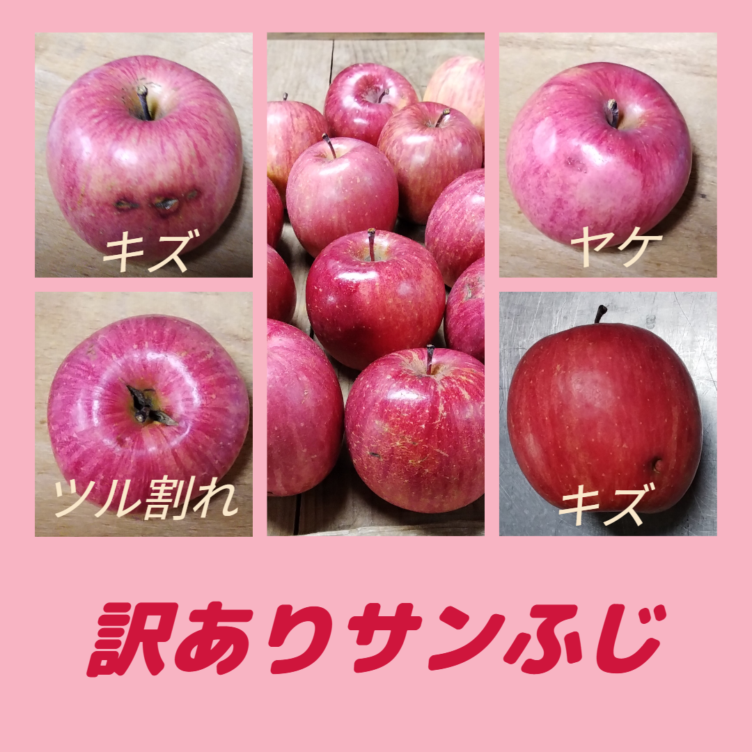 訳あり加工用りんごとは、極端な変形、キズ(乾燥したもの)、サビがひどいもの、ツルぬけ、ツル割れ、ツル割れの大きいもの、押しキズ、黒点、軟化などの難ありりんごです。